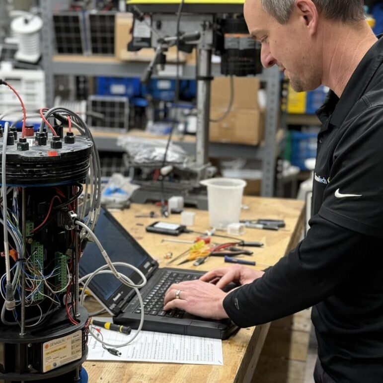 Next, the buoy’s electronic components—the “smart parts”—are separated from the floats and frames and evaluated using a multi-point inspection checklist. Waterproof seals are examined and maintained, connectors are tested for proper performance, and every electrical connection is verified to be secure.